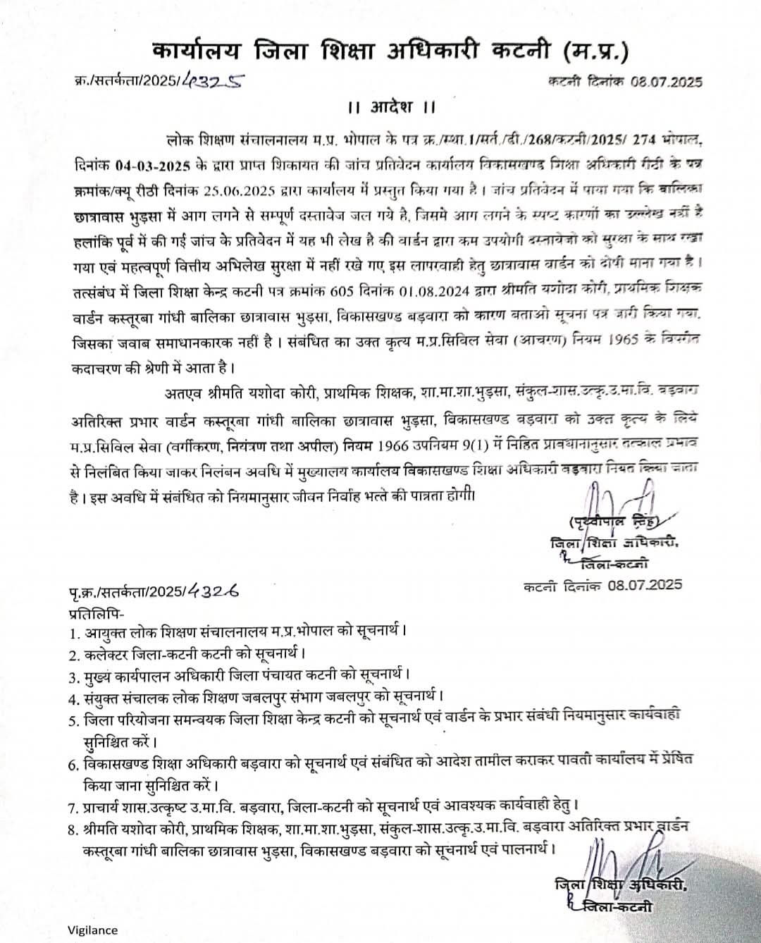 बड़वारा विकासखण्डा के ग्राम भुड़सा स्थित कस्तूरबा गांधी बालिका छात्रावास में आगजनी की घटना के बाद दस्तावेजों की क्षति को लेकर लापरवाही बरतने के मामले मे छात्रावास वार्डन श्रीमती यशोदा कोरी को जिला शिक्षा अधिकारी पी.पी. सिंह ने तत्काल प्रभाव से निलंबित कर दिया गया है।