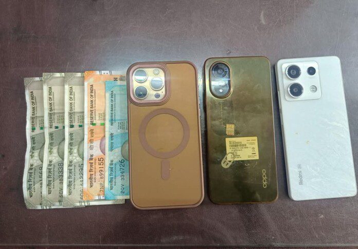 नगदी 1750 रूपये, 3 मोबाईल जप्त