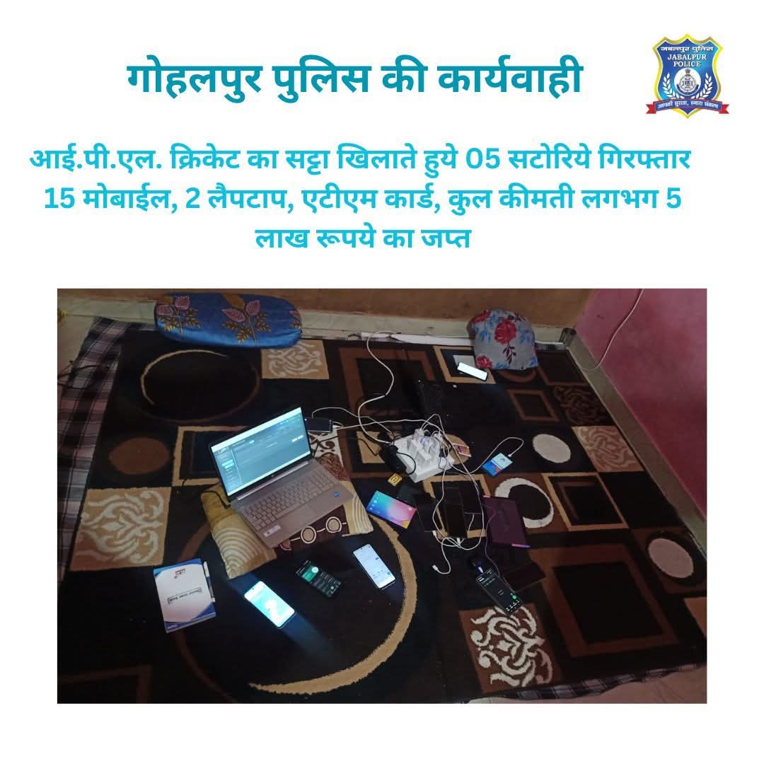 थाना प्रभारी गोहलपुर श्रीमती प्रतीक्षा मार्को ने बताया कि आज दिनांक 3-4-25 की रात्रि विश्वसनीय मुखबिर से सूचना मिली कि स्वर्ण सरोवर लाला पान चौक त्रिमूर्ति नगर में कुछ लोग मोबाइल लेपटाप से आईपीएल क्रिकेट मेैच में टीम की हार जीत पर सट्टा खिलाकर अवैध लाभ अर्जित कर रहे हैं । सूचना पर मुखबिर के बताये स्थान लाला पान चौक त्रिमूर्तिनगर पर स्वर्ण सरोवर मल्टी के द्वितीय तल पर पर दबिश दी गई कुछ लोग अपने पास लेपटाप मोबाइल में playadda के माध्यम से यूजरनेम play 04 व अन्य ऑडियो के माध्यम से आईपीएल क्रिकेट मैच टीम आरसीबी (रायल चैंलेन्जर बैंगलोर ) विरूद्ध जीटी (गुजराज टाईटन्स ) पर हारजीत का दाव लगाकर अवैध आर्थिक लाभ अर्जित कर अपने अलग अलग एकाउण्ट में रूपये डालते पाये गये जिनसे नाम पता पूछने पर अपने नाम निखिल जायसवाल उम्र 22 वर्ष निवासी चेरीताल वार्ड, सचिन फाल्के उम्र 30 वर्ष निवासी गाम जलेब थाना बुलढाणा महाराष्ट्र, मुकेश जायसवाल उम्र 26 वर्ष निवासी ग्राम लौर थाना मउगंज जिला रीवा, अविनाश बैजनानी उम्र 20 वर्ष निवासी खेवर लाईन संत कवार राम वार्ड कटनी मुडवारा जिला कटनी, नितिन मोहे उम्र 26 वर्ष निवासी जय मल्लाह चैाक जलेब थाना बुलढाणा महाराष्ट्र बताये, जिनके पास रखे मोबाइल, लेपटाप, एटीएम कार्ड रख मिले पूछताछ करने पर सभी ने उपरोक्त माध्यम से आनलाईन क्रिकेट मैचे के हारजीत का सट्टा खिलना सामुहिक रूप से स्वीकार किये आरोपियों के कब्जे से एचपी कम्पनी का 1 लेपटाप, 1 डेल कम्पनी का लेपटाप, विभिन्न कम्पनियों के 15 मोबाइल, एक एटीएम कार्ड, 4 मोबाइल चार्जर एक मोडल्युर बोर्ड, 2 लेपटाप के चार्जर, एडाप्टर जप्त करते हुये आरोपियों के विरूद्ध धारा 4(क) सट्टा एक्ट एवं 112 बीएनएस के तहत कार्यवाही की गई।