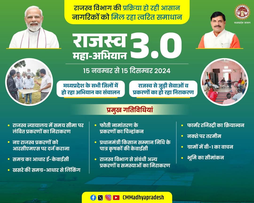 मुख्‍यमंत्री डॉ. मोहन यादव के निर्देश पर राजस्‍व प्रकरणों के निराकरण के लिए राजस्‍व महाअभियान चलाया जा रहा है।
