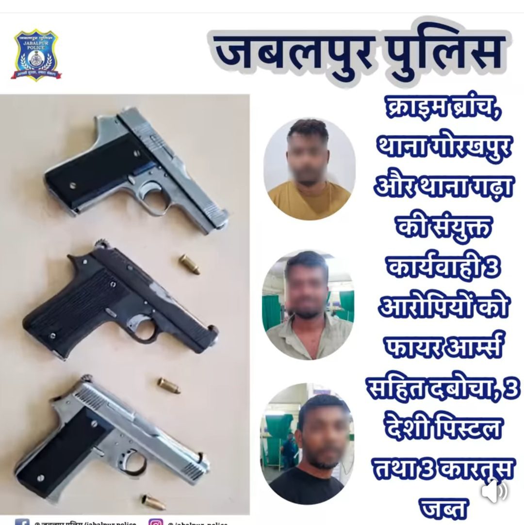 आदेश के परिपालन में अतिरिक्त पुलिस अधीक्षक जोन 2 श्री समर वर्मा, अतिरिक्त पुलिस अधीक्षक (अपराध/यातायात) श्रीमती सोनाली दुबे तथा नगर पुलिस अधीक्षक गढा श्री देवेन्द्र प्रताप सिंह चौहान एवं नगर पुलिस अधीक्षक गोरखपुर श्री एच.आर. पाण्डेय, उप पुलिस अधीक्षक अपराध श्री उदयभान बागरी के मार्गदर्शन में क्राईम ब्रांच तथा थाना गढा एवं गोरखपुर की टीम द्वारा ३ आरोपियों को 3 देशी पिस्टल एवं 3 कारतूस सहित रंगे हाथ पकडा गया है।