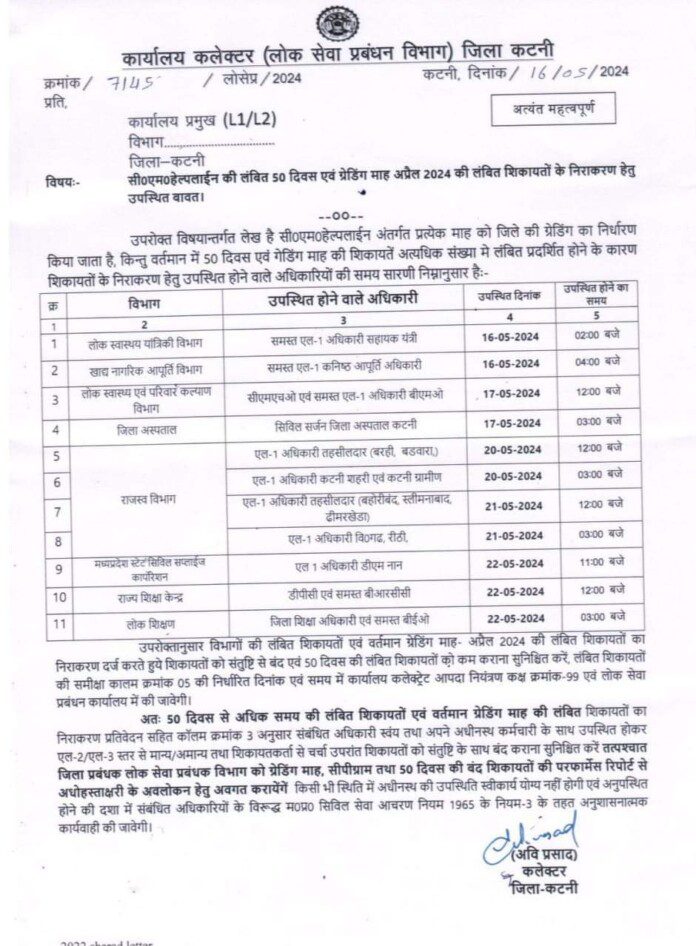 कलेक्टर श्री अवि प्रसाद नें सीएम हेल्पलाइन की 50 दिवस एवं ग्रेडिंग माह अप्रैल 2024 की लंबित शिकायतों के निराकरण हेतु तिथि एवं समय निर्धारित करते हुए जिले के 8 विभागों के 11 अधिकारियों कार्यालय प्रमुख व एल-1 अधिकारियों को निर्धारित तिथि एवं समय पर कार्यालय कलेक्ट्रेट आपदा नियंत्रण कक्ष क्रमांक 99 एवं लोक सेवा प्रबंधन कार्यालय में उपस्थित होकर शिकायतों का निराकरण कराने के निर्देश दिए है।