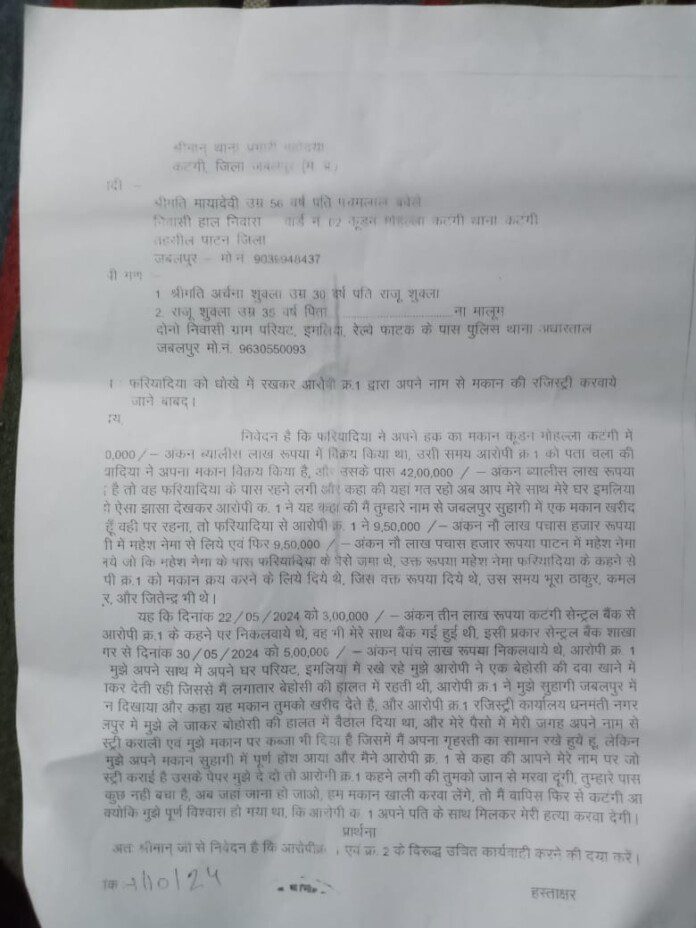 मामला कटंगी थाने का है जहा पर मायादेवी बरेली पति पंचम लाल बबेले वार्ड नं 02 कूडन मोहल्ला कटंगी निवासी का कहना है कि अर्चना पति राजू एवं मौसी- मौसियां – गुड्डी पति लखन ने जान से मारने की धमकी दी है, पूर्व में भी उनके द्वारा ने माया देवी को बहला- फुसला कर कटंगी स्थिति मकान, एव 2 लाख रुपए नगदी, जेवरात ( झुमकी, मंगल सूत्र, बडा बाला, 4 जोड़ी पायल, हाय चन्द्रमा आदि) ले लिया जिसकी लिखित शिकायत थाना जबलपुर आधारताल एवं थाना कटंगी मे की गई है ! वर्तमान में मायादेवी अपनी जान बचाते हुए कटंगी के मुकेश परिहार के यहां पर अपनी जान बचा कर रह रहीं हैं। जिनकी सहायता से मध्य प्रदेश जन अभियान परिषद ग्राम प्रस्फुटन समिति अध्यक्ष अशोक विश्वकर्मा ग्राम पंचायत हटोली नरीला मझौली निवासी के माध्यम से यह सलाह दी गई है की यदि शासन प्रशासन एवं आला अधिकारीयों द्वारा अर्चना पति राजू एवं मौसी- मौसियां – गुड्डी पति लखन पर कोई कार्रवाई नहीं की जाती तो वो वह खण्ड पीठ सदस्य पी. एल. व्ही जिला विधिक न्यायालय जबलपुर की शरण में जावे , जिससे आपको न्याय दिलाने का प्रयास किया जावेगा अब देखना यह होगा कि क्या माया देवी को न्याय मिल पाएगा