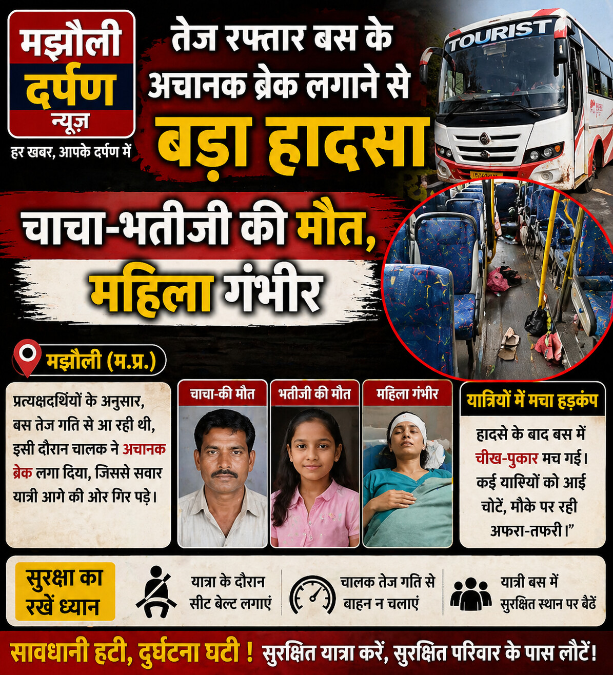 चौरसिया ट्रैवल्स की बस द्वारा अचानक ब्रेक लगाए जाने के कारण पीछे से आ रही मोटरसाइकिल अनियंत्रित होकर बस में जा घुसी। इस दर्दनाक हादसे में चाचा और 14 वर्षीय भतीजी की जान चली गई, जबकि मृतका की माँ जिंदगी और मौत के बीच जूझ रही है।