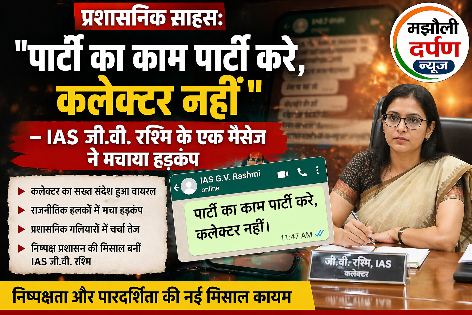 जी.वी. रश्मि का यह कदम उन सभी अधिकारियों के लिए एक ‘नजीर’ है जो राजनीतिक दबाव में अपने संवैधानिक कर्तव्यों को भूल जाते हैं। यह संदेश केवल एक निर्देश नहीं, बल्कि लोकतंत्र को जीवित रखने वाली वह छोटी कील’ है, जो व्यवस्था को पटरी से उतरने से बचाती है।