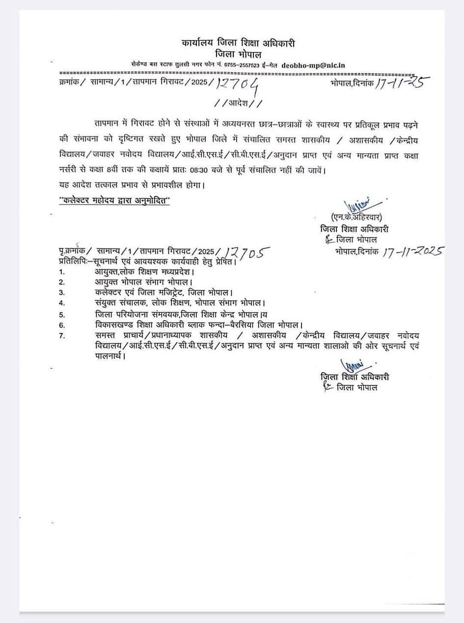 भोपाल जिले में तापमान में गिरावट होने से संस्थाओं में अध्ययनरत छात्र-छात्राओं के स्वास्थ्य पर प्रतिकूल प्रभाव पढ़ने की संभावना को दृष्टिगत रखते हुए भोपाल जिले में संचालित समस्त शासकीय / अशासकीय / केन्द्रीय विद्यालय/जवाहर नवोदय विद्यालय/आई.सी.एस.ई/सी.बी.एस.ई/अनुदान प्राप्त एवं अन्य मान्यता प्राप्त कक्षा नर्सरी से कक्षा 8वीं तक की कक्षायें प्रातः 08:30 बजे से पूर्व संचालित नहीं की जायें।