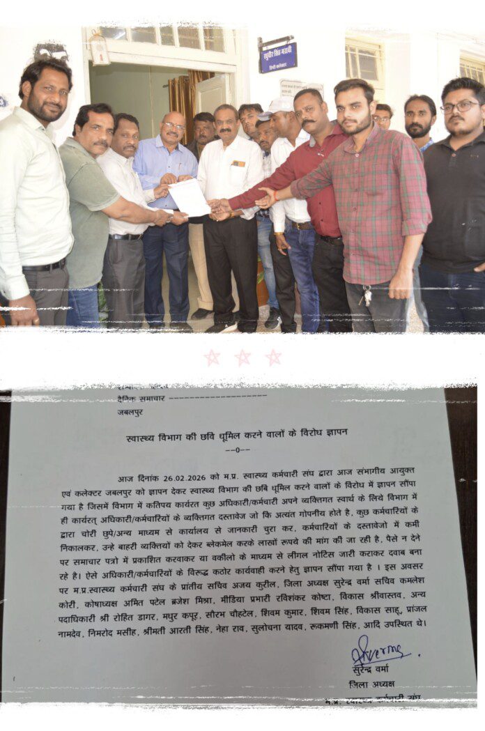 मध्यप्रदेश स्वास्थ्य कर्मचारी संघ, जिला शाखा जबलपुर ने स्वास्थ्य विभाग की छवि धूमिल करने और कर्मचारियों को कथित रूप से ब्लैकमेल करने के गंभीर आरोप लगाते हुए संभागीय आयुक्त एवं कलेक्टर जबलपुर को ज्ञापन सौंपा है। संघ ने मांग की है कि ऐसे अधिकारी/कर्मचारियों के विरुद्ध कठोर एवं तत्काल कार्रवाई की जाए।