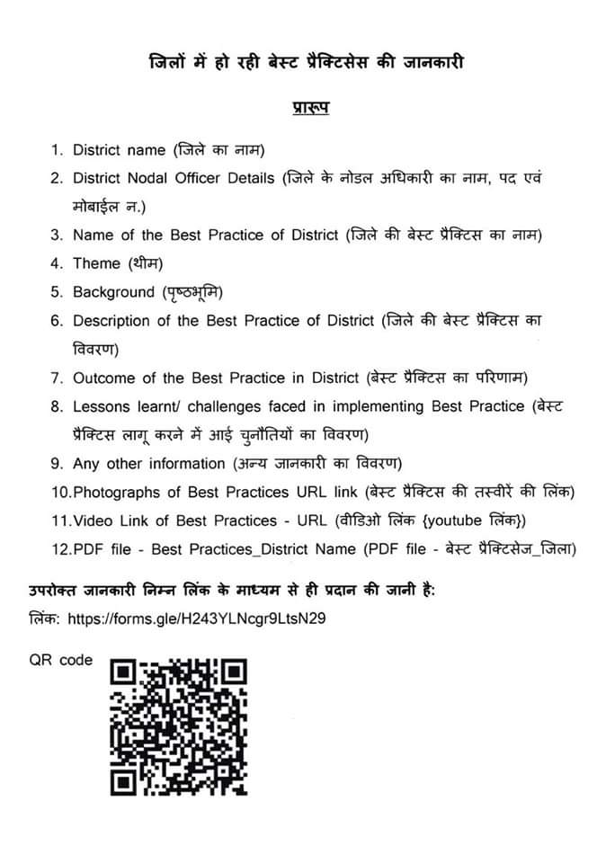 प्रमुख सचिव श्री शुक्ल ने कहा है कि आयोग द्वारा जिलों से प्राप्त आवेदनों को उनके नवाचार के आउटकम, रिप्लीकेबिलिटी और स्केलेबिलिटी के आधार पर चयनित किया जाएगा। चयनित किए गए जिलों के कलेक्टर या उनके जिलों के उप सचिव स्तर से अनिम्न अधिकारी को संगोष्ठी में प्रस्तुति के लिए आमंत्रित किया जाएगा अथवा बेस्ट प्रेक्टिसेस का प्रकाशन किया जाएगा। इस संबंध में समन्वय हेतु श्री ईश गुप्ता, कसलटेंट, राज्य नीति आयोग (ईमेल gupta.ish@mp.gov.in से संपर्क किया जा सकता है। सभी को निर्देशित किया गया है कि संलग्न लिंक में अपने जिलों की बेस्ट प्रेक्टिसेस की जानकारी प्रविष्ट करें। सभी जिले गूगल फॉर्म के माध्यम से आवेदन जमा करने के पात्र होंगे। आवेदन की गूगल फॉर्म की लिंक तथा जानकारी प्रारूप संलग्न है। लिंक एवं जानकारी प्रारूप के लिये यहां क्लिक करें।