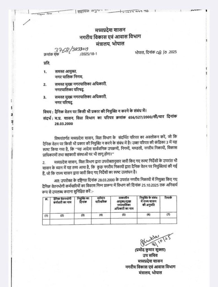 विभाग के उप सचिव प्रमोद कुमार शुक्ला द्वारा हस्ताक्षरित आदेश में कहा गया है कि शासन के स्पष्ट प्रतिबंध के बावजूद कुछ नगरीय निकायों द्वारा नियमों की अनदेखी कर दैनिक वेतनभोगियों की नियुक्तियाँ की जा रही हैं। यह सीधे तौर पर राज्य शासन के निर्देशों का उल्लंघन है।