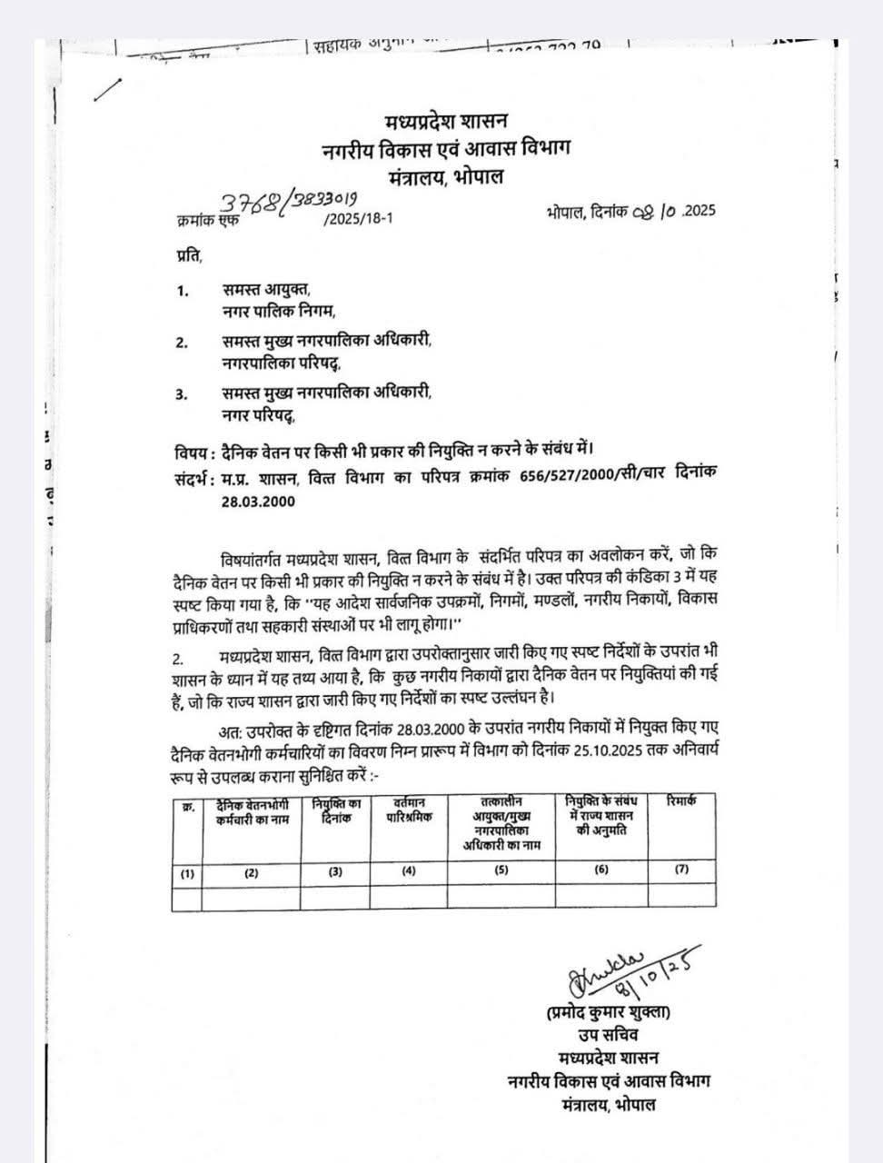 इस पृष्ठभूमि में, विभाग ने सभी संबंधित अधिकारियों को दिनांक 25 अक्टूबर 2025 तक एक निर्धारित प्रारूप में जानकारी प्रस्तुत करने के निर्देश दिए हैं। इसमें उन सभी दैनिक वेतनभोगी कर्मचारियों की जानकारी मांगी गई है जिन्हें 28 मार्च 2000 के बाद नियुक्त किया गया है। मांगे गए विवरण में कर्मचारी का नाम, नियुक्ति की तिथि, वर्तमान वेतन, नियुक्ति के समय के आयुक्त/CMO का नाम, राज्य शासन की अनुमति और अन्य टिप्पणियाँ शामिल हैं।