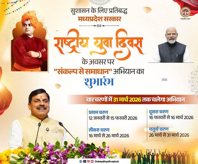 विकसित मध्यप्रदेश के लक्ष्य की प्राप्ति के लिये केन्द्र और राज्य सरकार की योजनाओं एवं सेवाओं का लाभ पात्र व्यक्तियों को दिलाने के लिये 12 जनवरी से 31 मार्च तक के “संकल्प से समाधान” अभियान का आज स्वामी विवेकानंद की जयंती से जिले में प्रारंभ हुआ। चार चरणों के इस अभियान में ग्राम पंचायत, नगरीय निकाय एवं जिला स्तर पर पात्र हितग्राहियों को लाभान्वित करने के लिये वार्ड स्तरीय समितियों का गठन किया गया है। आवेदन एवं शिकायतों के एकत्रीकरण के लिए भी दल गठित किये गये हैं। अभियान की सम्पूर्ण कार्यवाही सी.एम. हेल्पलाइन पोर्टल के माध्यम से संपादित की जायेगी।