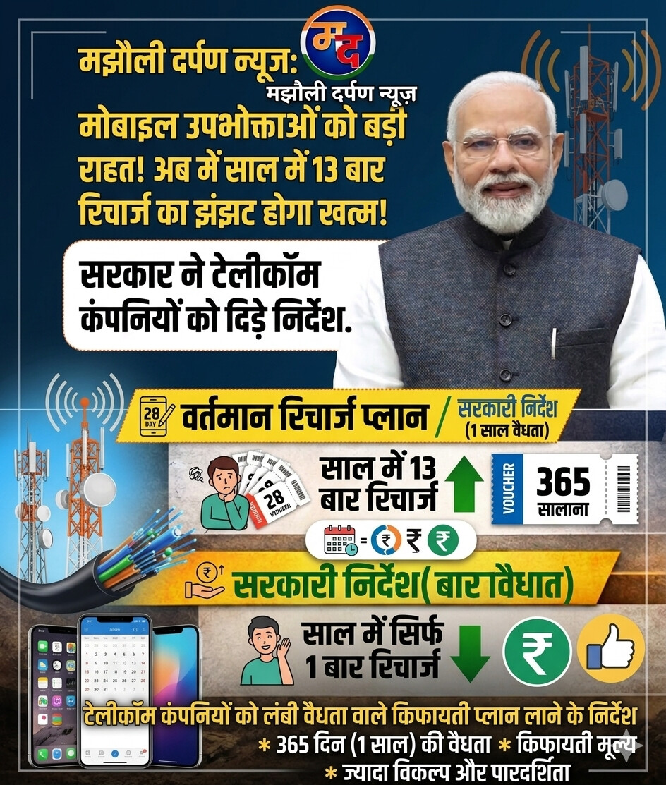 मोबाइल उपभोक्ताओं के लिए एक राहत भरी खबर सामने आई है। केंद्र सरकार ने टेलीकॉम कंपनियों की मनमानी पर लगाम कसते हुए उन्हें लंबी वैधता (Long Validity) वाले किफायती प्लान पेश करने के कड़े निर्देश दिए हैं। इस कदम का मुख्य उद्देश्य उपभोक्ताओं को हर महीने रिचार्ज कराने की मजबूरी से आजादी दिलाना है।