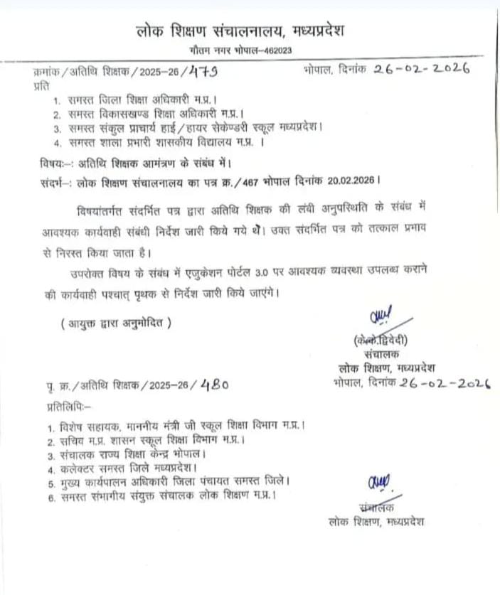 अब संबंधित विभाग द्वारा उक्त आदेश को निरस्त कर दिया गया है। माना जा रहा है कि यह निर्णय अतिथि शिक्षकों की मांगों और जमीनी परिस्थितियों को ध्यान में रखते हुए लिया गया है। प्रदेश में अतिथि शिक्षकों की नियुक्ति एवं सेवा संबंधी व्यवस्थाएं मध्य प्रदेश स्कूल शिक्षा विभाग के अंतर्गत संचालित होती हैं, जहां समय-समय पर दिशा-निर्देश जारी किए जाते हैं।
