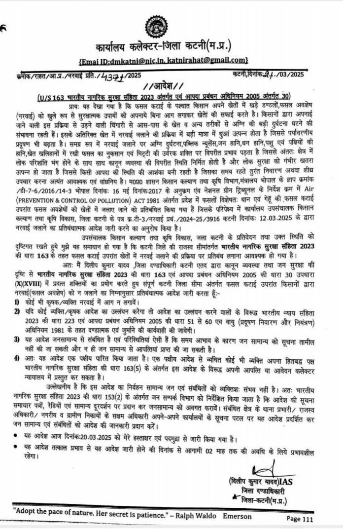 जिला दंडाधिकारी श्री यादव द्वारा यह प्रतिबंधात्मक आदेश उपसंचालक किसान कल्याण तथा कृषि विकास द्वारा प्रस्तुत प्रतिवेदन के आधार पर जारी किया गया है। कलेक्टर श्री यादव ने भारतीय नागरिक सुरक्षा संहिता 2023 के धारा 163 के तहत और आपदा प्रबंधन अधिनियम के प्रावधानों के तहत फसल कटाई उपरांत खेतों में नरवाई जलाने की प्रक्रिया को प्रतिबंधित किया है।