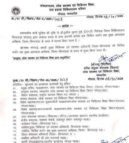 मध्य प्रदेश के छिंदवाड़ा जिले में जहरीले कफ सिरप से बच्चों की मौतों का मामला तूल पकड़ता जा रहा है। इस बीच, राज्य सरकार ने लापरवाही के आरोपों के बीच सिविल सर्जन डॉ. नरेश गोन्नाने को तत्काल प्रभाव से हटा दिया है।