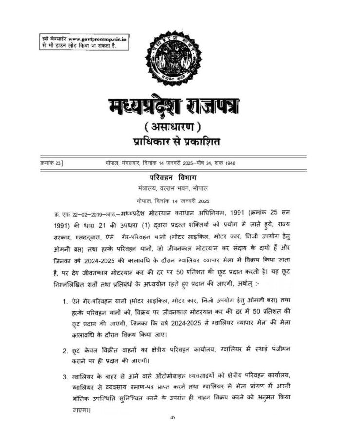 मुख्यमंत्री डॉ मोहन यादव ने ग्वालियर मेला में व्यापार को बढ़ावा देने के लिए बड़ी सौगात दी है। जिसके तहत श्रीमंत माधवराव सिंधिया ग्वालियर व्यापार मेला में हलके वाहनों की बिक्री पर रोड टैक्स ( मोटरयान कर) में 50 प्रतिशत की छूट मिलेगी। राज्य सरकार के परिवहन विभाग द्वारा मध्यप्रदेश मोटरयान कराधान अधिनियम के तहत इस आशय की अधिसूचना प्रकाशित( गजट नोटिफिकेशन) कर दी गई है।