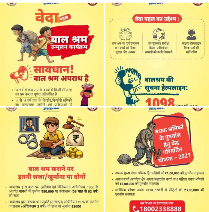 बाल श्रम जैसी सामाजिक बुराई को जड़ से समाप्त करने के लिए VEDA पहल के अंतर्गत बाल श्रम उन्मूलन कार्यक्रम को तेज़ी से लागू किया जा रहा है। इस अभियान का उद्देश्य बच्चों को श्रम के दलदल से बाहर निकालकर शिक्षा, सुरक्षा और सम्मानजनक भविष्य प्रदान करना है। प्रशासन द्वारा निरंतर कार्रवाई, निगरानी और अभियोजन के माध्यम से यह स्पष्ट संदेश दिया जा रहा है कि बाल श्रम किसी भी सूरत में बर्दाश्त नहीं किया जाएगा।