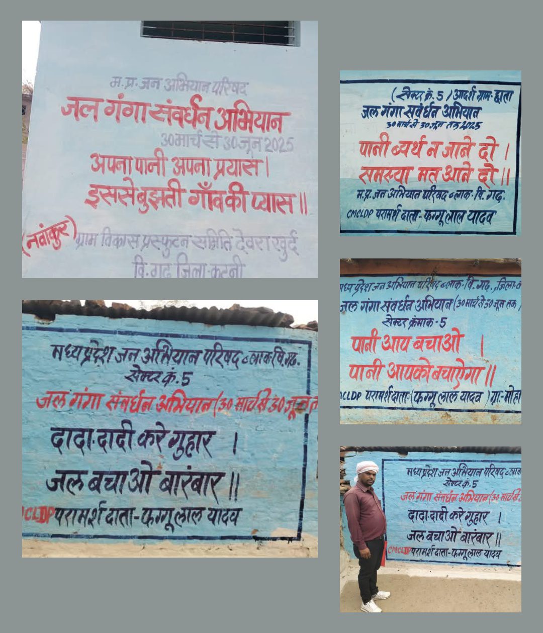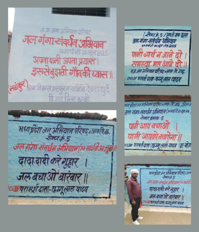 इसी क्रम में कटनी के विकासखंड विजयराघवगढ़ की ग्राम विकास प्रस्फुटन समिति देवराखुर्द एवं परामर्शदाता द्वारा जल गंगा संवर्धन अभियान के अंतर्गत आने वाले विभिन्न ग्रामों के शासकीय भवनों, दीवारों में स्लोगन के माध्यम से ग्रामीणों को जल का महत्व बताया गया।