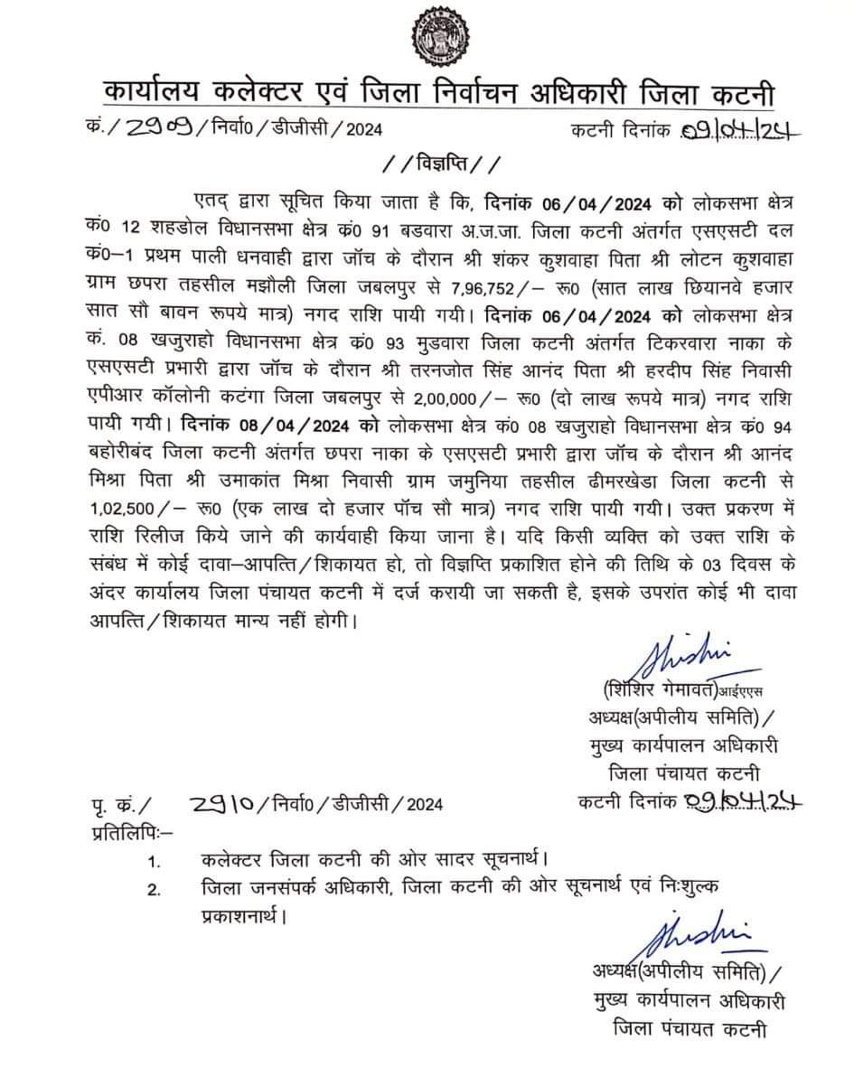 लोकसभा निर्वाचन की लागू आदर्श आचार संहिता के दौरान जिले में स्थापित किये गए चेकपोस्टों में जांच के दौरान अलग -अलग तीन प्रकरणों में जब्त की गई नगद राशि कुल 10 लाख 99 हजार 252 के संबंध में तीन दिनों के भीतर दावा- आपत्ति जिला पंचायत कार्यालय में प्रस्तुत की जा सकती है।