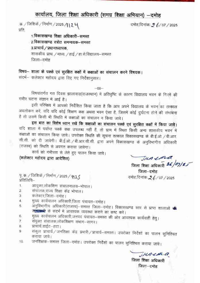 गत दिवस झालावाड़ (राजस्थान) में अतिवृष्टि के कारण विद्यालय भवन के गिरने की गंभीर घटना संज्ञान में आई हैं। इस सबंध में विकासखण्ड शिक्षा अधिकारी समस्त, विकासखण्ड स्त्रोत समन्वयक समस्त, प्राचार्य/प्रधानाध्यापक, शासकीय प्राथमिक/माध्यमिक/हाई/हायर सेकेण्डरी विद्यालय समस्त से कहा विद्यालय के भवन का तत्काल अवलोकन किया जाये, यदि कोई शिक्षण कक्ष अथवा भवन ऐसा है, जिसमें कोई दुर्घटना होने की संभावना हैं तो उसमें किसी भी स्थिति में कक्षाओं का संचालन न किया जाये।