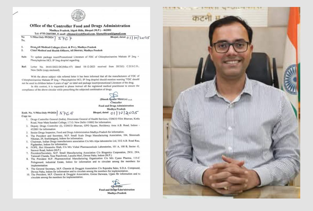 खाद्य एवं औषधि प्रशासन विभाग के नियंत्रक श्री दिनेश कुमार मौर्य ने समस्त औषधि निर्माताओं, औषधि निरीक्षकों, मुख्य चिकित्सा एवं स्वास्थ्य अधिकारियों तथा मेडिकल कॉलेजों के डीन को 1 अक्टूबर 2025 को क्लोर फ़ेनिरामाइन मेलिएट एवं फ़ेनाइलफ़्रिन एचसीएल के उपयोग के संबंध में एडवाइजरी जारी की गई है। जिसमें क्लोरफेनिरामीन मेलिएट IP 2mg + फिनाईलफ्रिन HCL IP 5mg ड्रॉप/मि.ली. के संयोजन (एफ.डी.सी.) का निर्माण करने वाली सभी कम्पनियों को अपने औषधि के लेबल, पैकेज इंसर्ट एवं प्रचार साहित्य पर यह चेतावनी स्पष्ट उल्लेखित होनी चाहिए की -“यह एफ.डी.सी. 4 वर्ष से कम आयु के बच्चों में उपयोग नहीं किया जाना चाहिए।
