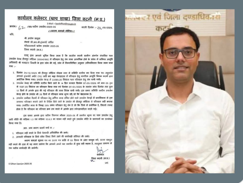 कटनी ग्रामीण तहसील के अंतर्गत संचालित धान उपार्जन केंद्र हीरापुर कौड़िया (59342186) में परिवहन हेतु 23 हजार 989 क्विंटल धान परिवहन हेतु शेष पाये जाने पर कलेक्टर श्री आशीष तिवारी ने परिवहनकर्ता मेसर्स जी.आर.सी. ट्रांसपोर्ट सर्विस के श्री अशोक सलूजा को कारण बताओ नोटिस जारी किया है। परिवहनकर्ता को 3 दिनों के भीतर जवाब प्रस्तुत करने निर्देशित किया गया है।