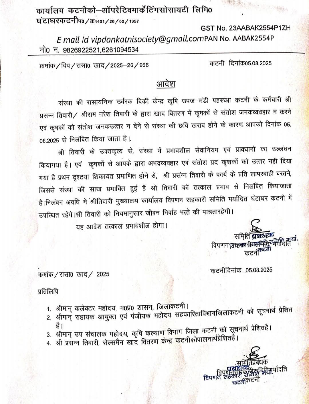 कलेक्टर श्री यादव के निर्देश पर समिति प्रबंधक विपणन सहकारी समिति मर्यादित कटनी ने खाद वितरण केंद्र के सेल्समैन प्रसन्न तिवारी को किसानों के साथ असंतोषजनक व्यवहार करने और संस्था की छवि खराब करने के आरोप में निलंबित कर दिया है।
