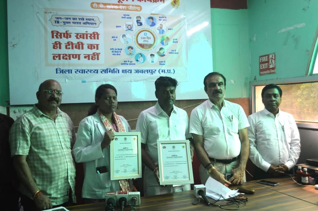 जिला चिकित्सालय परिसर स्थित टीबी अस्पताल के सभागार में आज शुक्रवार को आयोजित कार्यक्रम में सौ दिवसीय निःक्षय शिविर अभियान के अंतर्गत राज्य स्तर पर उत्कृष्ट पुरस्कार प्राप्त करने के लिये बरगी की कम्युनिटी हेल्थ ऑफिसर सुश्री निशा मार्को एवं जबलपुर के सामाजिक कार्यकर्ता मीनेश जैन का सम्मान किया गया।