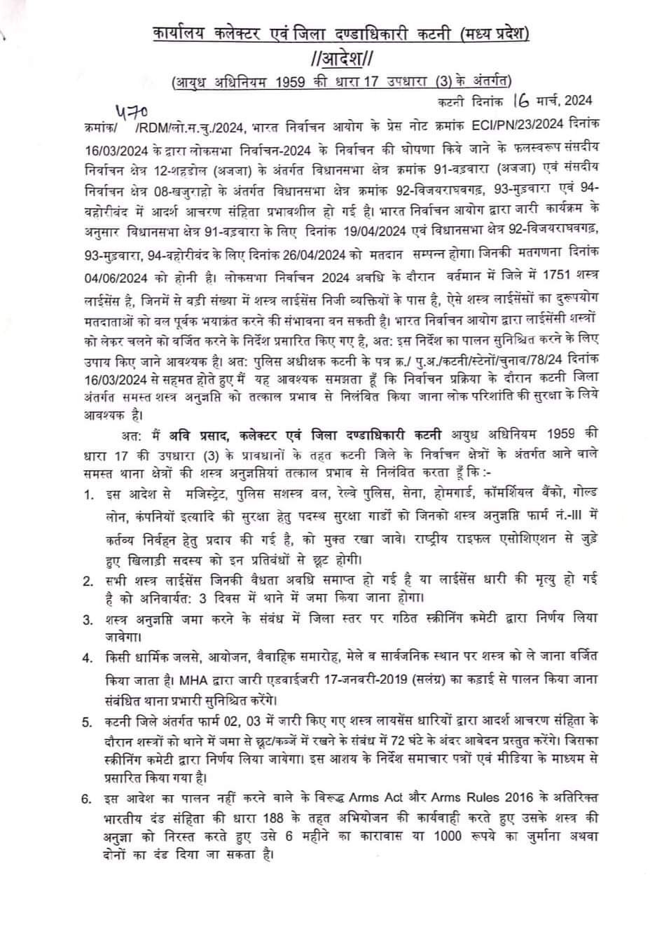 इस आदेश का उल्लंघन करने वाले के विरूद्ध आर्म्स एक्ट और आर्म्स नियम के अतिरिक्त भारतीय दंड संहिता की धारा 188 के तहत अभियोजन की कार्यवाही करते हुए उसके शस्त्र की अनुज्ञा को निरस्त करते हुए उसे 6 महीने का कारावास या 1 हजार रुपये का जुर्माना अथवा दोनों का दंड दिया जा सकता है। यह आदेश तत्काल प्रभाव से कटनी जिले अंतर्गत आने वाले निर्वाचन क्षेत्रों एवं जिले की राजस्व सीमाओं के अंतर्गत प्रभावशील रहेगा।