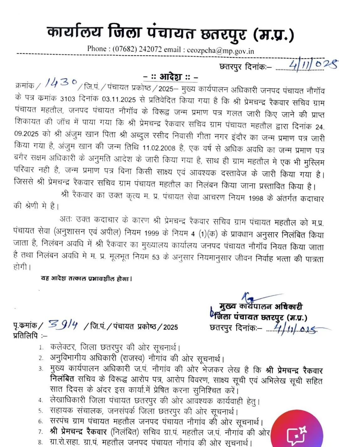 इनके विरुद्ध म.प्र. पंचायत सेवा (अनुशासन एवं अपील) नियम 1999 के नियम 4 (1) (क) के प्रावधान अनुसार निलंबित की कार्यवाही की गई है। निलंबन अवधि में इनका मुख्यालय कार्यालय जनपद पंचायत नौगाँव नियत किया गया है तथा निलंबन अवधि में म. प्र. मूलभूत नियम 53 के अनुसार नियमानुसार जीवन निर्वाह भत्ता की पात्रता होगी। यह आदेश तत्काल प्रभावशील होगा।