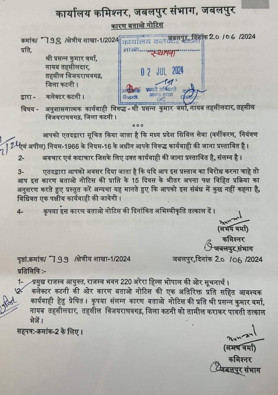संभागायुक्त श्री अभय वर्मा ने तहसील विजयराघवगढ़ के नायब तहसीलदार प्रसन्न कुमार वर्मा को अवचार एवं कदाचार के लिए कारण बताओ नोटिस जारी किया है।