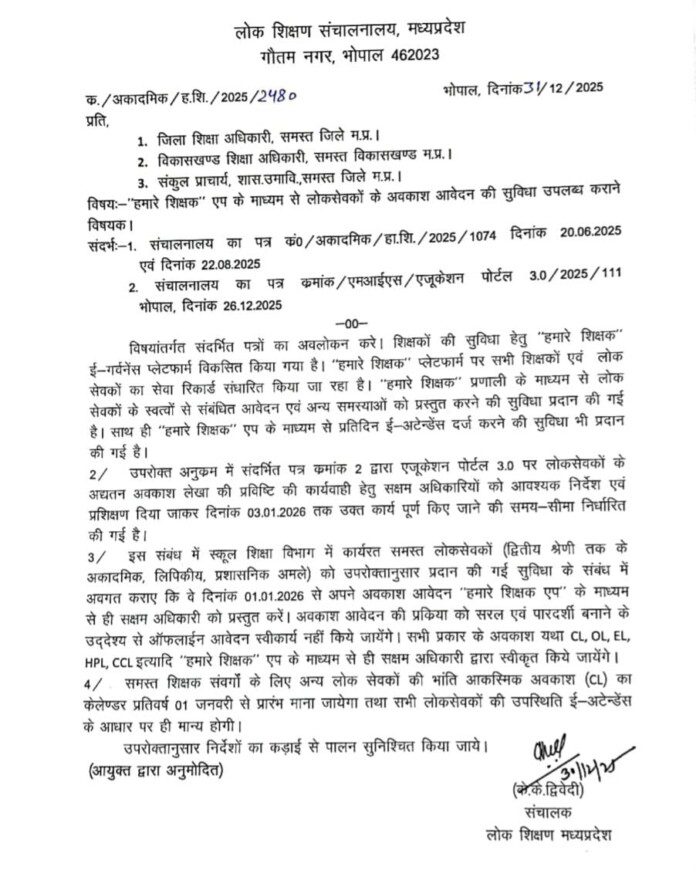 संचालनालय द्वारा 31 दिसंबर 2025 को जारी पत्र क्रमांक क./अकादमिक/ह.शि./2025/2480 में स्पष्ट किया गया है कि 01 जनवरी 2026 से सभी प्रकार के अवकाश आवेदन केवल “हमारे शिक्षक” एप के माध्यम से ही स्वीकार किए जाएंगे। ऑफलाइन अवकाश आवेदन पूर्णतः प्रतिबंधित रहेंगे।