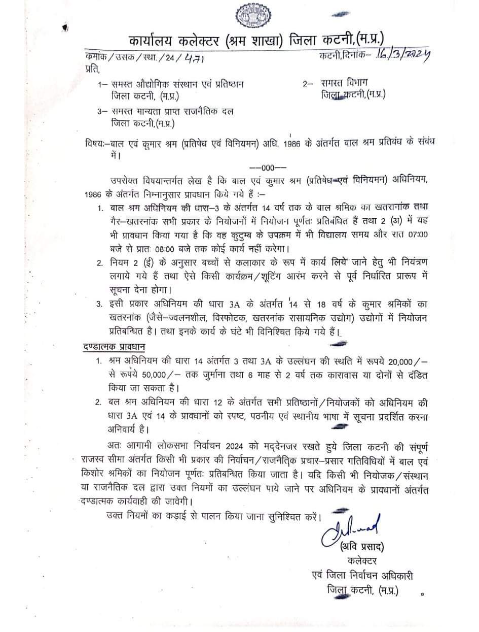 कलेक्टर अवि प्रसाद ने आगामी लोकसभा निर्वाचन 2024 को मद्देनजर रखते हुये जिला कटनी की संपूर्ण राजस्व सीमा अंतर्गत किसी भी प्रकार की निर्वाचन, राजनैतिक प्रचार-प्रसार गतिविधियों में बाल एवं किशोर श्रमिकों का नियोजन पूर्णतः प्रतिबन्धित किया गया है। यदि किसी भी नियोजक, संस्थान या राजनैतिक दल द्वारा उक्त नियमों का उल्लंघन पाए जाने पर अधिनियम के प्रावधानों अंतर्गत दंडात्मक कार्यवाही की जावेगी।