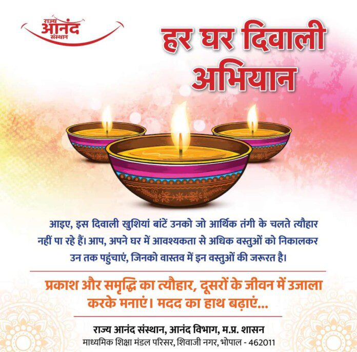 राज्य आंनद संस्थान आम नागरिकों के सहयोग से दीपावली पर गरीब परिवारों के घरों को रोशन करने इस वर्ष भी #हर_घर_दीवाली अभियान चलायेगा। अभियान के तहत इस दीपावली पर जबलपुर जिले में कम से कम पाँच सौ परिवारों के घरों को रोशन करने का लक्ष्य रखा गया है। नागरिकों से ज्यादा सहयोग मिलने पर इस लक्ष्य को बढ़ाया भी जा सकेगा।