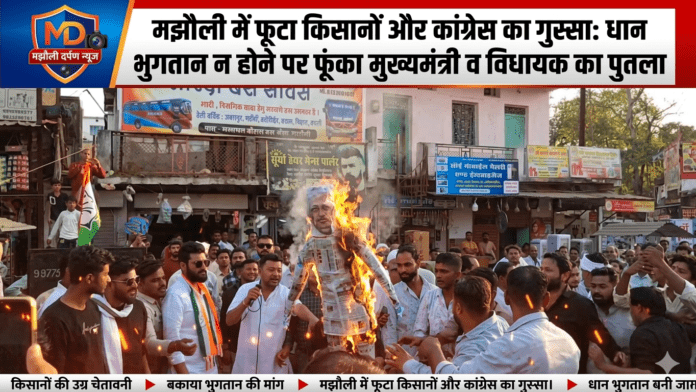 मझौली में फूटा किसानों और कांग्रेस का गुस्सा: धान का भुगतान न होने पर फूंका मुख्यमंत्री व विधायक का पुतला