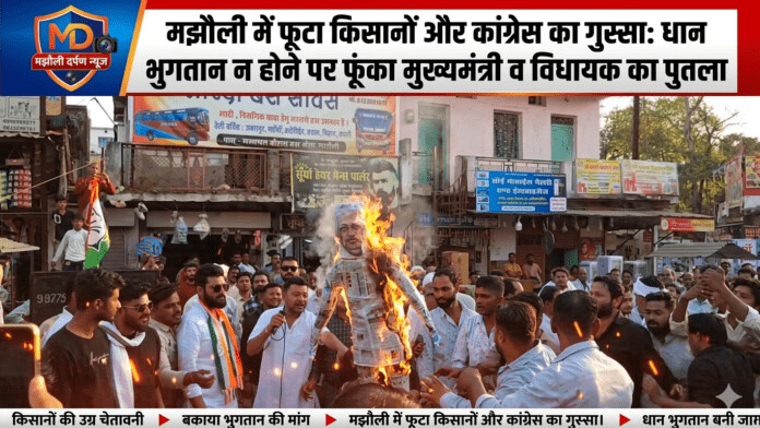 मझौली तहसील के सामने पिछले एक महीने से अपनी फसल के भुगतान की बाट जोह रहे किसानों का सब्र अब जवाब दे गया है। गुरुवार को कांग्रेस कार्यकर्ताओं ने किसानों के समर्थन में उतरते हुए पोला तिराहा पर उग्र प्रदर्शन किया और मुख्यमंत्री एवं क्षेत्रीय विधायक का पुतला दहन किया।