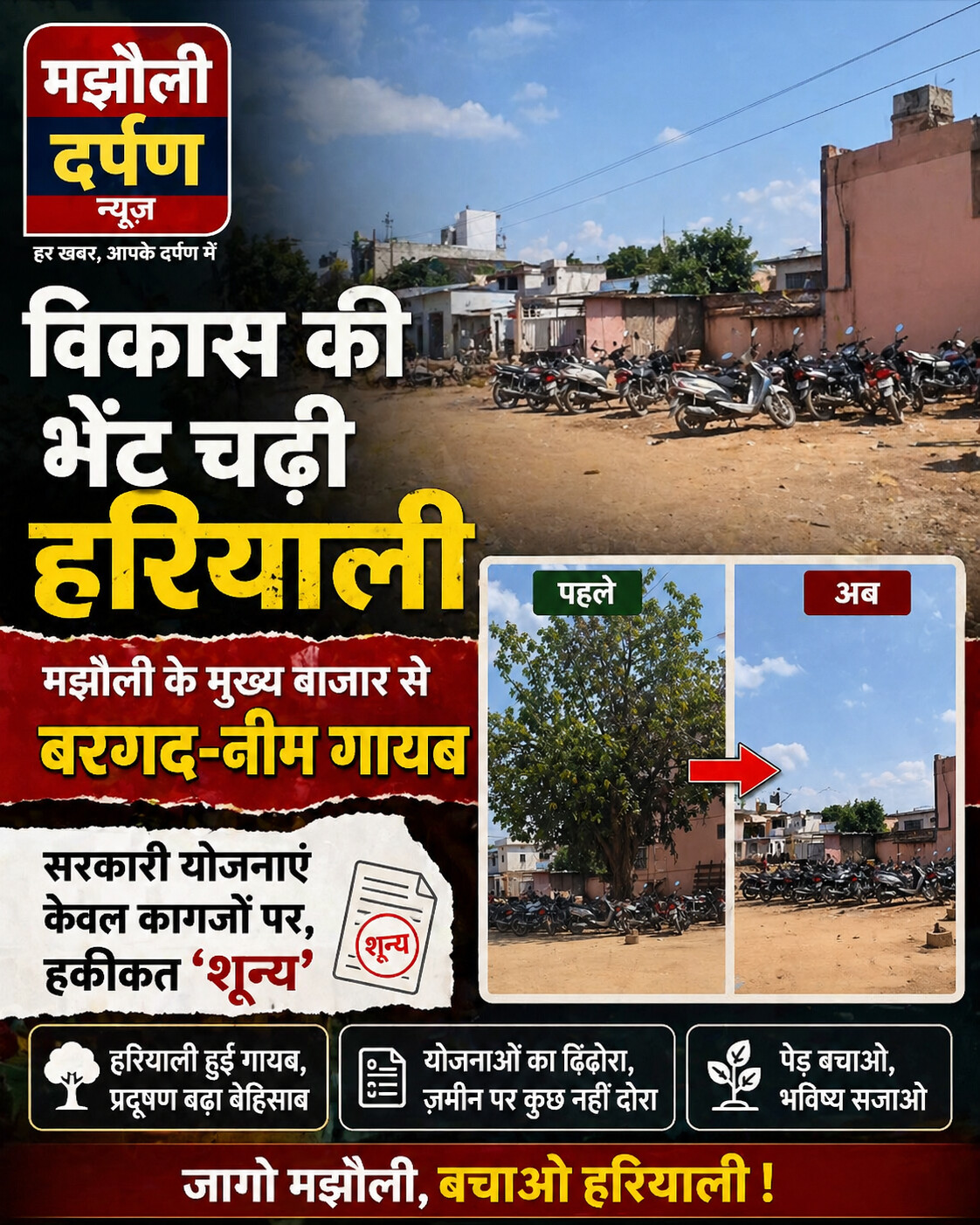 मझौली नगर के मुख्य बाजार की तपती सड़कें इस बात का प्रमाण हैं कि जमीनी स्तर पर पर्यावरण संरक्षण के नाम पर केवल खानापूर्ति की जा रही है। विकास की अंधी दौड़ और प्रशासनिक अनदेखी के कारण नगर के हृदय स्थल से नीम और बरगद जैसे विशाल पेड़ पूरी तरह विलुप्त हो चुके हैं।