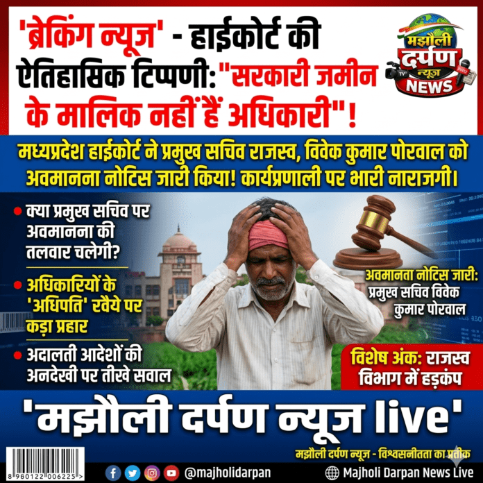 एक मामले की सुनवाई के दौरान कोर्ट ने दो टूक शब्दों में कहा कि “अधिकारी खुद को सरकारी जमीन का मालिक न समझें।” कोर्ट ने इस मामले में राजस्व विभाग के प्रमुख सचिव विवेक कुमार पोरवाल को कारण बताओ नोटिस जारी कर जवाब तलब किया है।