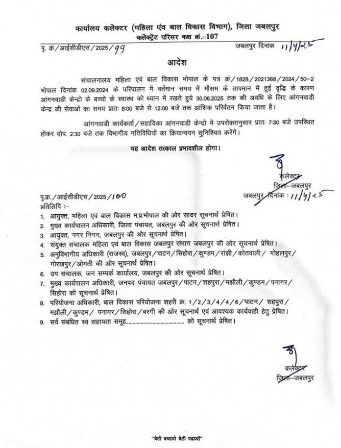 तापमान में लगातार हो रही वृद्धि को देखते हुये कलेक्टर दीपक सक्सेना ने आदेश जारी कर जिले में स्थित सभी आंगनबाड़ी केंद्रों की सेवाओं के समय में 30 जून तक के लिये परिवर्तन किया है। बच्चों के स्वास्थ्य के मद्देनजर जारी इस आदेश के मुताबिक जिले में स्थित सभी आंगनबाड़ी केंद्रों की सेवायें अब सुबह 8 बजे से दोपहर 12 बजे तक जारी रहेंगी। आदेश तत्काल प्रभाव से लागू हो गया है और 30 जून तक प्रभावी रहेगा। आदेश में स्पष्ट किया गया है कि आंगनबाड़ी कार्यकर्ताओं और सहायिकाओं को आंगनबाड़ी केंद्रों में उपस्थित होकर सुबह 7.30 बजे से दोपहर 2.30 बजे तक विभागीय गतिविधियों का क्रियान्वयन सुनिश्चित करना होगा।