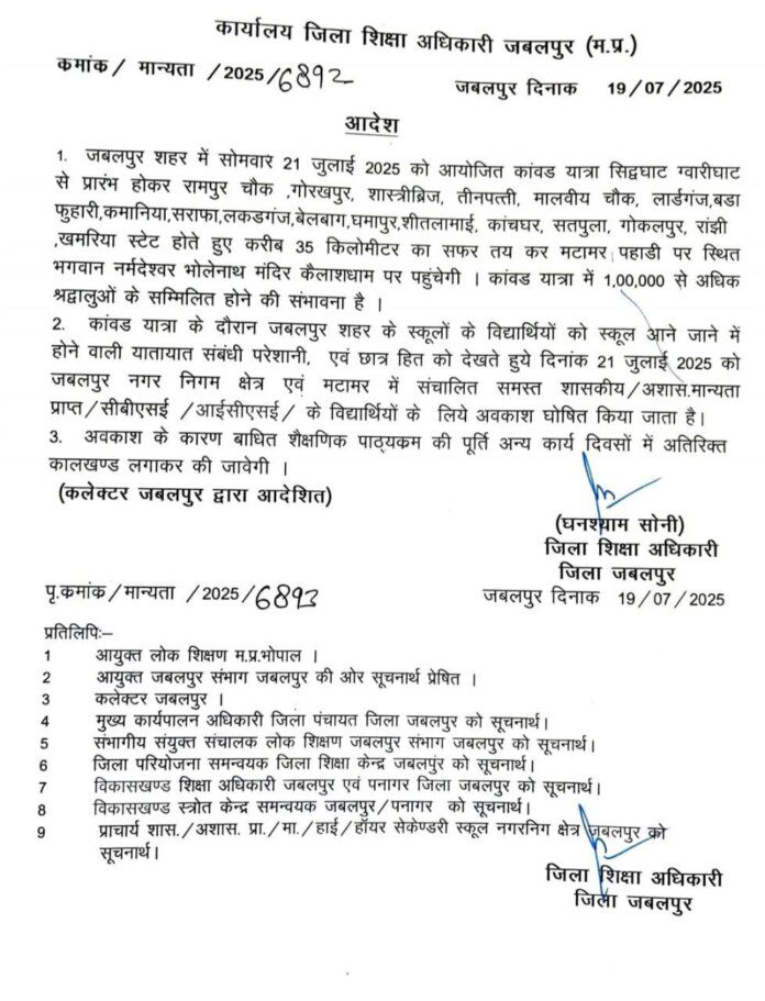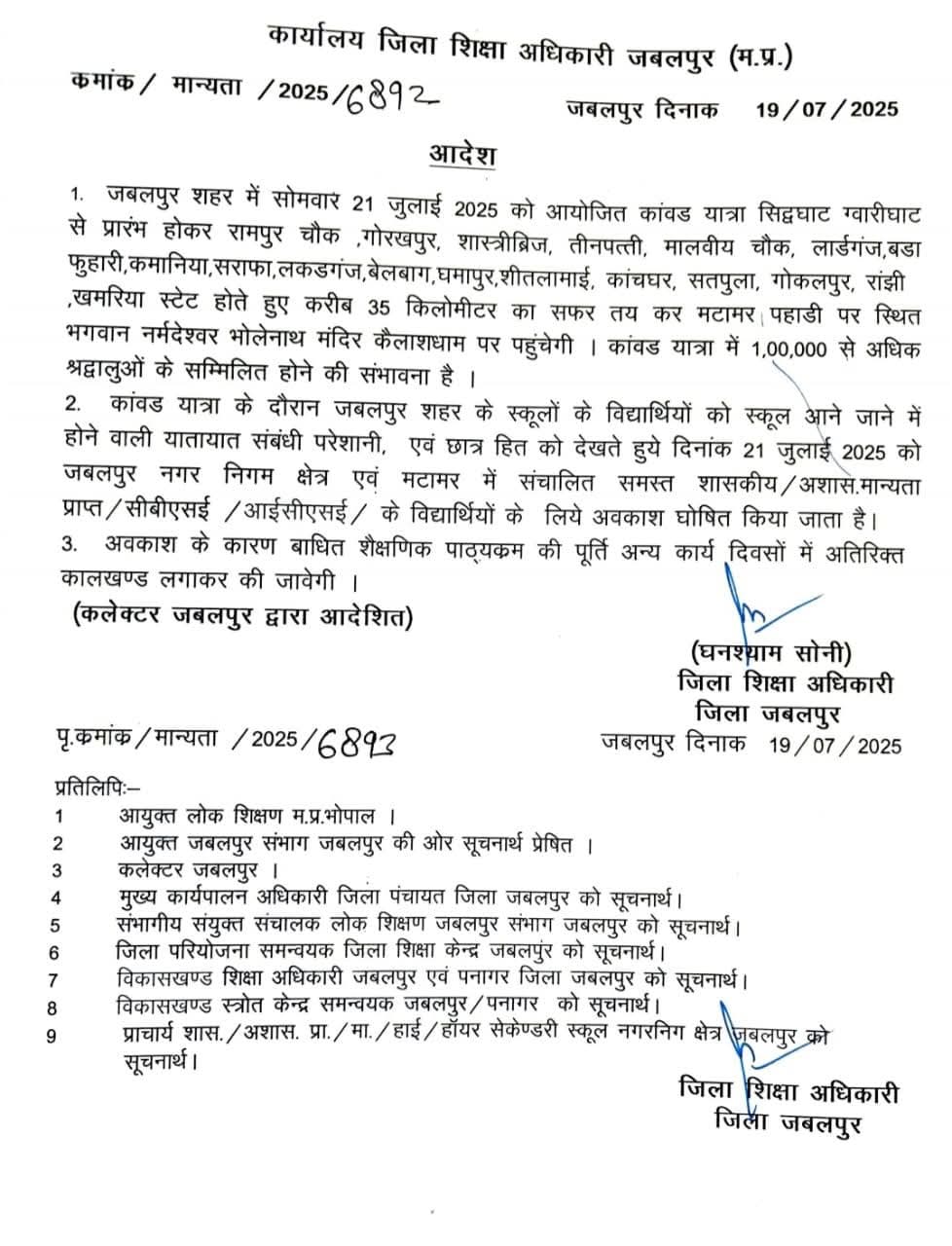 कलेक्टर एवं जिलादंडाधिकारी श्री दीपक सक्सेना के निर्देश पर कांवड यात्रा के दौरान जबलपुर शहर के स्कूलों के विद्यार्थियों को स्कूल आने जाने में होने वाली यातायात संबंधी कठिनाईयों एवं छात्र हित को देखते हुये सोमवार 21 जुलाई को नगर निगम जबलपुर सीमा क्षेत्र एवं मटामर में संचालित सभी शासकीय एवं अशासकीय मान्यता प्राप्त शालाओं में विद्यार्थियों के लिये अवकाश घोषित किया गया है।