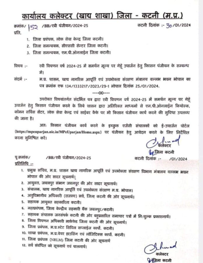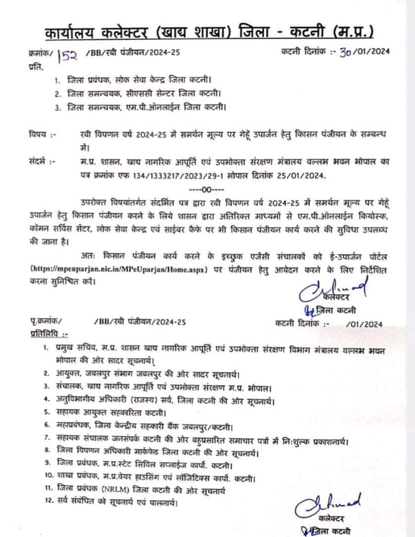 उल्लेखनीय है कि शासन निर्देशानुसार रबी विपणन वर्ष 2024-25 में समर्थन मूल्य पर गेहूं उपार्जन हेतु किसान पंजीयन करने के लिये शासन द्वारा अतिरिक्त माध्यमों से एम. पी. ऑनलाईन कियोस्क, कॉमन सर्विस सेंटर, लोक सेवा केन्द्र एवं साईबर कैफे पर भी किसान पंजीयन कार्य करने की सुविधा उपलब्ध की जाना है।