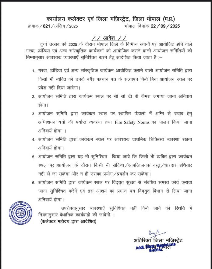 दुर्गा उत्सव पर्व 2025 के दौरान भोपाल जिले में गरबा, डांडिया और सांस्कृतिक कार्यक्रमों के आयोजन को लेकर जिला प्रशासन ने सुरक्षा एवं व्यवस्थाओं को लेकर निर्देश जारी किए हैं।