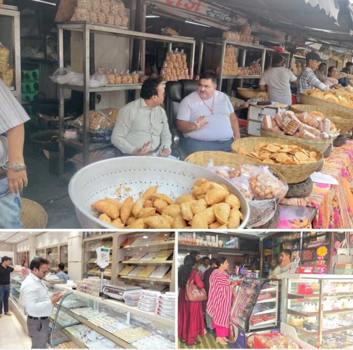 निर्देश के पालन में खाद्य सुरक्षा अधिकारियों द्वारा जिले में मावा विकय केन्द्रों, मिष्ठान्न तथा नमकीन निर्माण/विकय संस्थानों का निरीक्षण किया जा रहा है। इस दौरान तिलहरी स्थित श्री बीकानेर मिष्ठान्न भण्डार से मावा तथा बेसन लड्डू सालीवाड़ा स्थित अन्नपूर्णा स्वीट्स से बूंदी लडडू तथा नमकीन, नौदरा ब्रिज स्थित हीरा स्वीट्स से गुलाबजामुन तथा छैना रसगुल्ला, गोरखपुर स्थित आरती स्वीट्स से आटा लड्डू तथा नमकीन सेव, राज स्वीट्स से मगज लड्डू तथा नमकीन, विनोद किराना स्टोर से हल्दी पाउड़र तथा नमकीन, होम साइंस कॉलेज रोड़ स्थित सुरेश एण्ड संस से मावा लड्डू तथा काजू सेव, कटंगी रोड़ स्थित बड़कुल स्वीट्स से मावा कतली तथा बेसन लड्डू, शुभांश स्वीट्स से मावा बर्फी तथा नमकीन, धनगवां स्थित मां होटल एवं स्वीट्स से नमकीन, धनवंतरीनगर स्थित आनंदम स्वीट्स से खोवा बर्फी तथा पेड़ा के नमूने लिये गये।