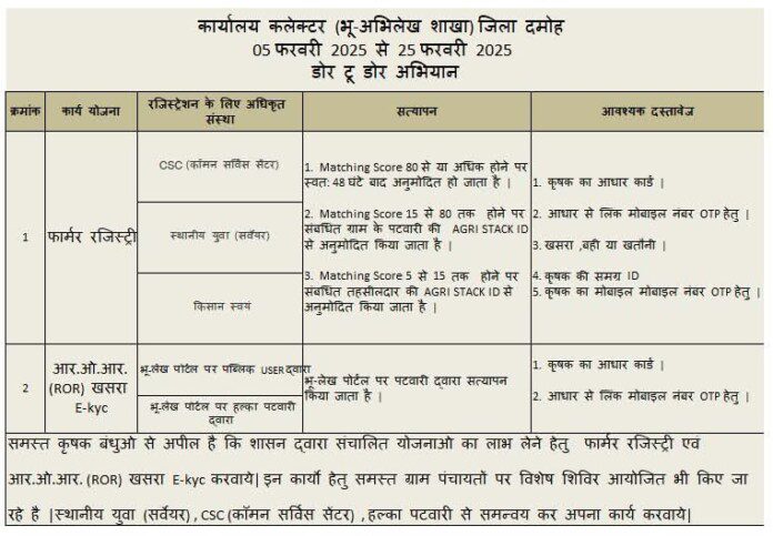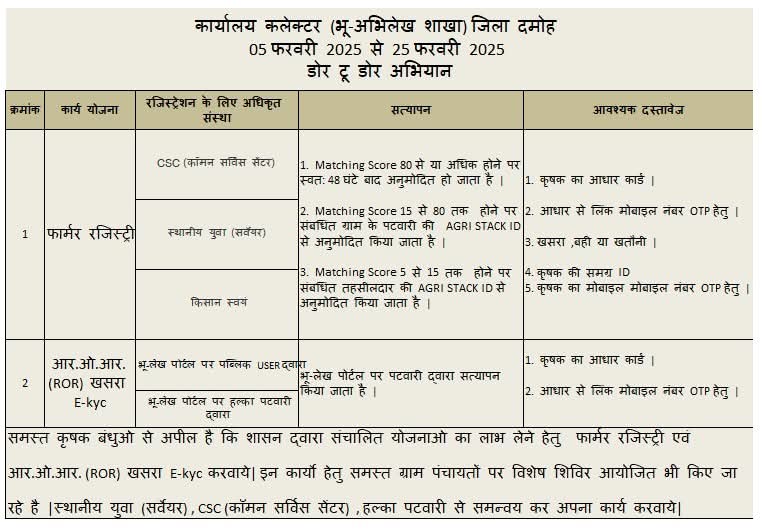 किसानों से आग्रह करते हुये कहा किसान आई-डी बनवाइये, यदि किसान आई-डी बनाने में कोई दिक्कत आ रही है, तो आप दमोह हेल्पलाईन नंबर 07812-350300 पर शिकायत दर्ज कर सकते हैं, आपकी शिकायत तत्काल निराकृत कराई जायेगी। इसी प्रकार आपको अपने खसरा की ई-केवाईसी कराना है, जिसको हम आर.ओ.आर. खसरा ई-केवाईसी कराना बोलते हैं। पटवारी इसका सत्यापन करते हैं और इसमें केवल आधार कार्ड और संबंधित के मोबाइल नंबर की जरूरत पड़ती है। सभी किसान भाईयों से कहा सरकार की योजनाओं का लाभ लेने के लिए किसान आई-डी और खसरे का ई-केवाईसी बनवाना आवश्यक होगा। यदि आपने दोनों चीजें नहीं बनवाई हैं तो आगे चलकर आप कई योजनाओं के लाभ से वंचित रह सकते हैं। इसीलिए 28 फरवरी तक गांव-गांव में कैंप लगाये जा रहे हैं और लगातार अपने लोगों को भेज करके यह कार्रवाई कराएँगे, आप सब हमारा सहयोग करें और अधिक से अधिक किसान अपनी फार्मर रजिस्ट्री कराए और आर.ओ.आर खसरे का ई-केवाईसी करायें। यह एक बार कराना है, एक बार यह काम हो गया तो आगे चल करके आपको किसी प्रकार की दिक्कत नहीं आने वाली है। इसलिये सभी किसानो से आग्रह है कि ये दोनों काम जरूर करा लें और कोई भी दिक्कत हो तो दमोह हेल्पलाईन नंबर 07812-350300 पर जरूर संपर्क करें।