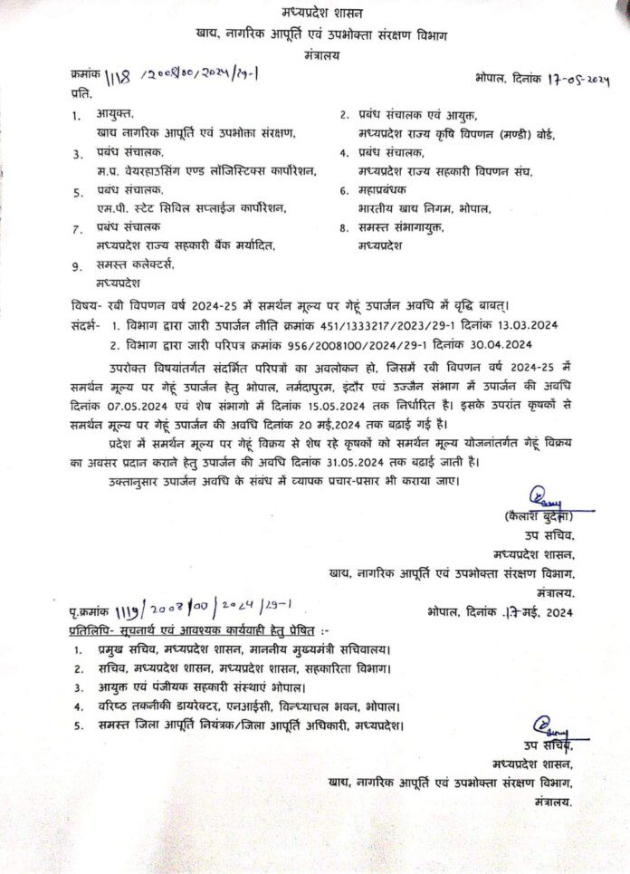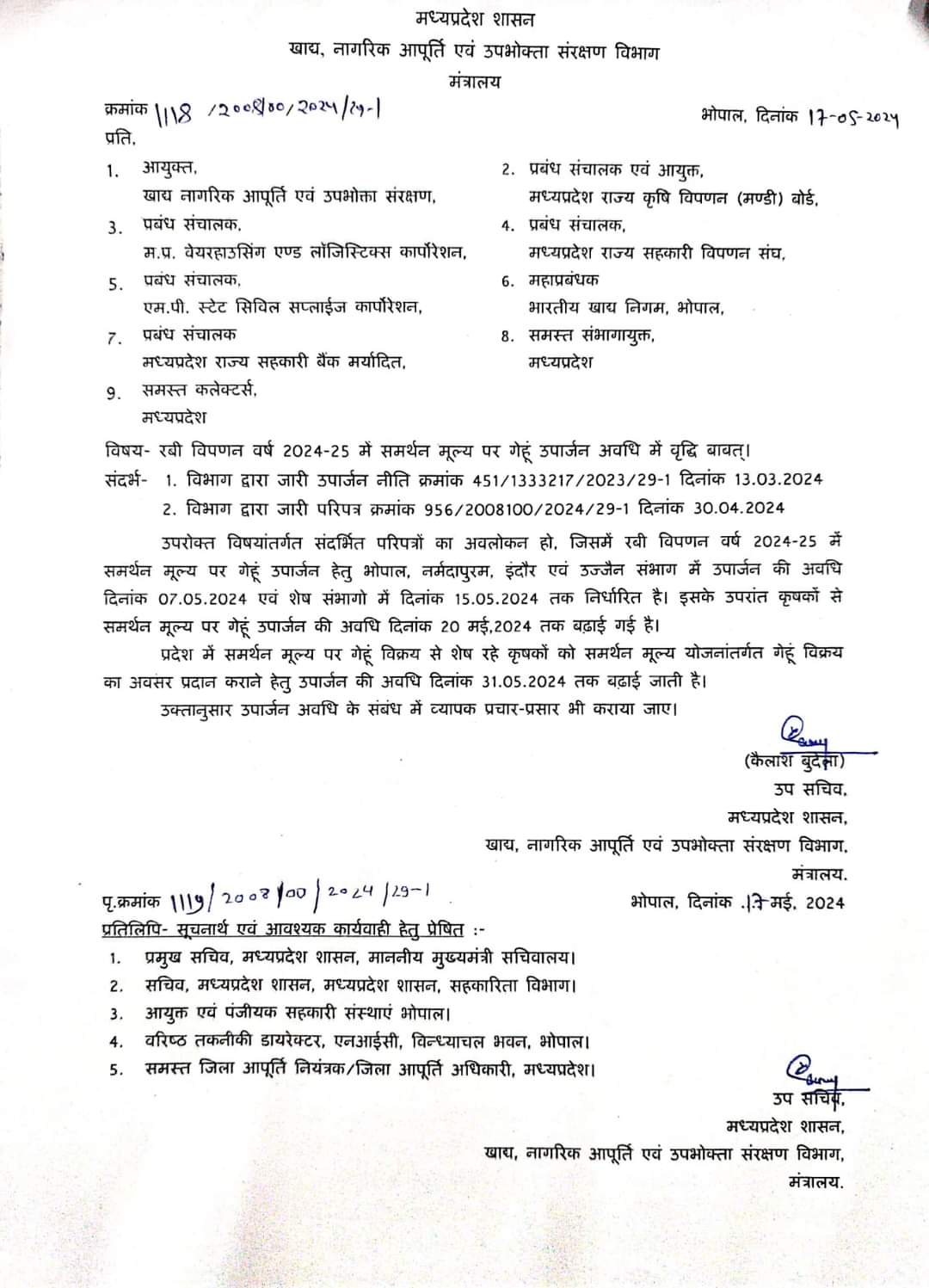 किसानों की सुविधा को देखते हुये राज्य शासन ने एक बार फिर बढ़ाई गेहूँ उपार्जन की अवधि. अब 31 मई तक समर्थन मूल्य पर खरीदा जायेगा किसानों से गेहूँ .