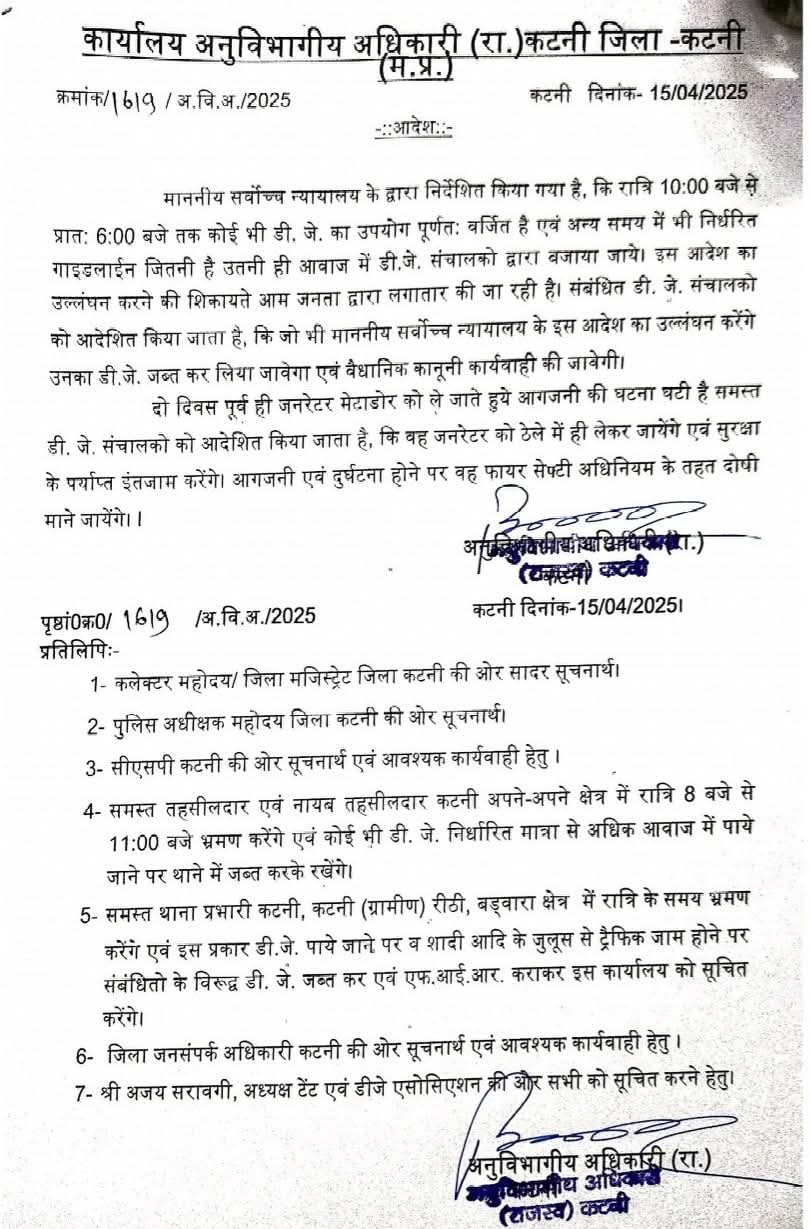 अनुविभागीय अधिकारी राजस्व कटनी श्री प्रदीप कुमार मिश्रा ने मंगलवार को एक आदेश जारी कर उल्लेखित किया है कि रात 10 बजे से प्रातरू 6 बजे तक डी.जे. का उपयोग वर्जित होने के बाद भी इसके उल्लंघन करने की शिकायते आम जनता द्वारा लगातार की जा रही है। इसी के मद्देनजर अनुविभागीय अधिकारी कटनी ने संबंधित डी.जे. संचालको को आदेश जारी करते हुए माननीय सर्वाेच्च न्यायालय के आदेश का उल्लंघन करने पर डी.जे. जब्त करने एवं वैधानिक कानूनी कार्यवाही करने की चेतावनी दी है।