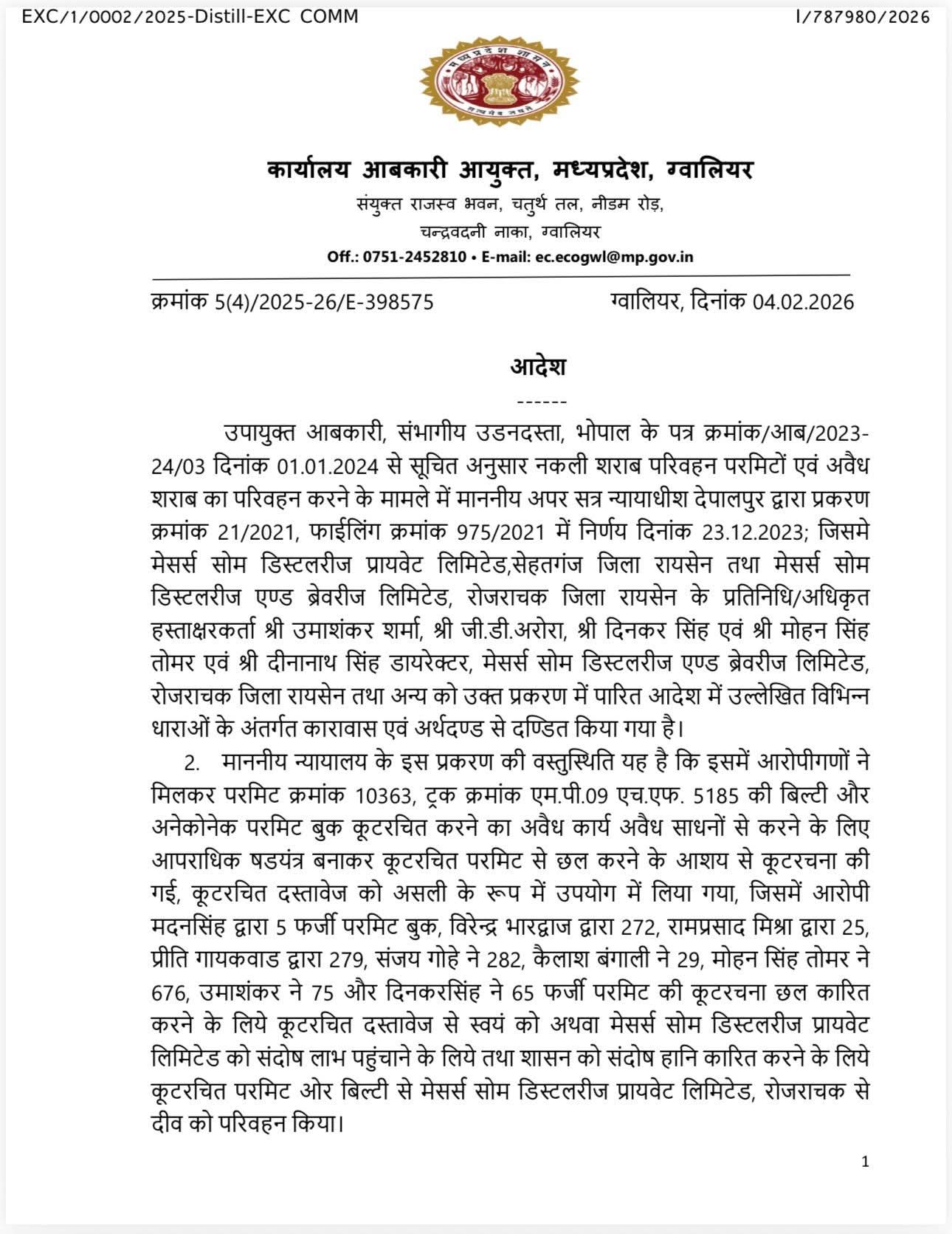 कार्यालय आबकारी आयुक्त, मध्यप्रदेश, ग्वालियर द्वारा दिनांक 04 फरवरी 2026 को जारी आदेश (क्रमांक 5(4)/2025-26/E-398575) में देपालपुर के माननीय अपर सत्र न्यायाधीश के निर्णय का हवाला देते हुए पूरे प्रकरण की गंभीरता उजागर की गई है।