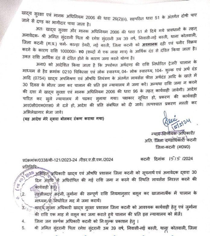 अतिरिक्त जिला दंडाधिकारी द्वारा जारी आदेश में अनावेदक अनावेदक अमित सुंदरानी पिता श्री रमेश सुंदरानी निवासी नई बस्ती फर्म कान्हा डेयरी पर अवमानक दही एवं पनीर का विक्रय करने पर 1 लाख रूपए का आर्थिक दंड अधिरोपित किया है।