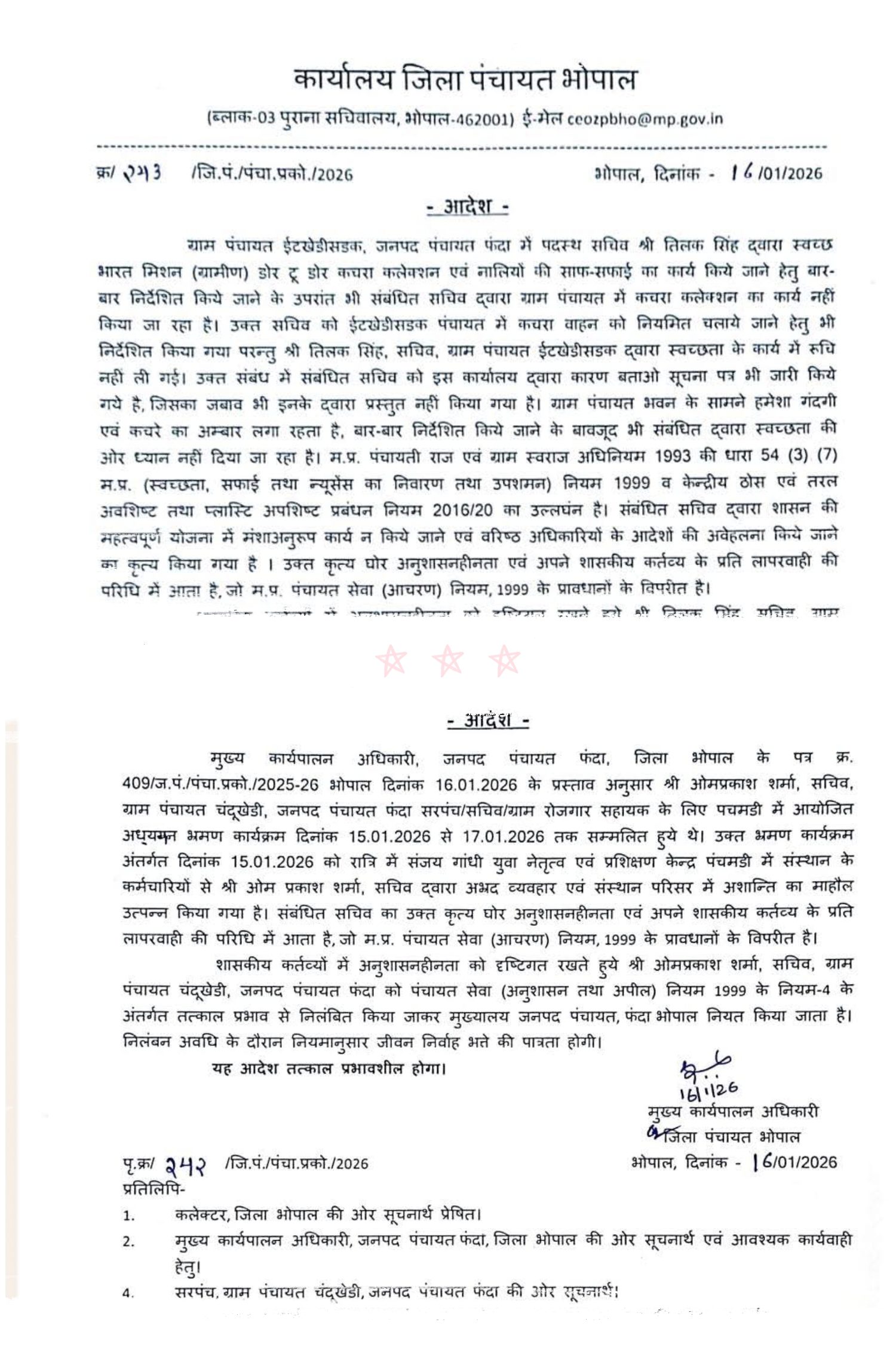 जिला पंचायत भोपाल की मुख्य कार्यपालन अधिकारी श्रीमती इला तिवारी ने कड़ा रुख अपनाते हुए ग्राम पंचायत ईटखेड़ीसड़क और चंदूखेड़ी के ग्राम पंचायत सचिवों को तत्काल प्रभाव से निलंबित कर दिया है।