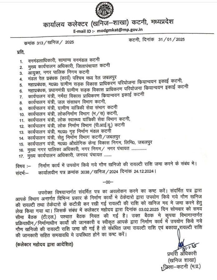इस संबंध में प्रभारी अधिकारी खनिज शाखा द्वारा वनमंडलाधिकारी, सामान्य वन मंडल कटनी,मुख्य कार्यपालन अधिकारी, जिला पंचायत, आयुक्त, नगर पालिक निगम, महाप्रबंधक, म०प्र० ग्रामीण सड़क विकास प्राधिकरण परियोजना कियान्वयन इकाई, मंडल रेल प्रबंधक (कार्य) पश्चिम मध्य रेल जबलपुर, महाप्रबंधक, प्रधानमंत्री ग्रामीण सड़क विकास प्राधिकरण परियोजना कियान्वयन इकाई,कार्यपालन यंत्री, नर्मदा विकास प्राधिकरण कियान्वयन इकाई ,कार्यपालन यंत्री, जल संसाधन विभाग, ग्रामीण यांत्रिकी सेवा संभाग,लोकनिर्माण विभाग (भ/स), लोक स्वास्थ्य यांत्रिकी सेवा विभाग, लोक निर्माण विभाग (पी.आई.यू.),म.प्र. गृह निर्माण मंडल , सेतु निर्माण विभाग कटनी,जबलपुर, म.प्र. औद्योगिक केन्द्र विकास निगम, लिमिटेड, जबलपुर, मुख्य नगर पालिका अधिकारी, नगर निगम, नगर पंचायत सहित जनपद पंचायतों के मुख्य कार्यपालन अधिकारियों को विभाग अंन्तर्गत प्रक्रियाधीन, निर्माणाधीन कार्यों की जानकारी तथा निर्माण कार्य में उपयोग किए गए गौण खनिजों की जमा की गई रॉयल्टी की राशि एवं बकाया रॉयल्टी राशि की जानकारी सहित समय अवधि मे उपस्थित होने के निर्देश दिए गए है।